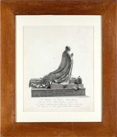 Papa Pio VI in preghiera, scultura di Antonio Canova. Da un disegno di Giovanni Tognoli (1786 - 1862) Raffigura il monumento commissionato al Canova dal Duca Braschi, nipote di Pio VI, un tempo davanti la Confessione della Basilica di San Pietro ed oggi nelle Grotte Vaticane. Iniziato nel 1817 e terminato da aiuti essendo il Canova morto nell'ottobre del 1822. Entro cornice moderna in legno color noce. incisione all'acquaforte Calcografia Nazionale cm 51x42 la lastra - il foglio cm 86x61,5 - in cornice cm 85x73