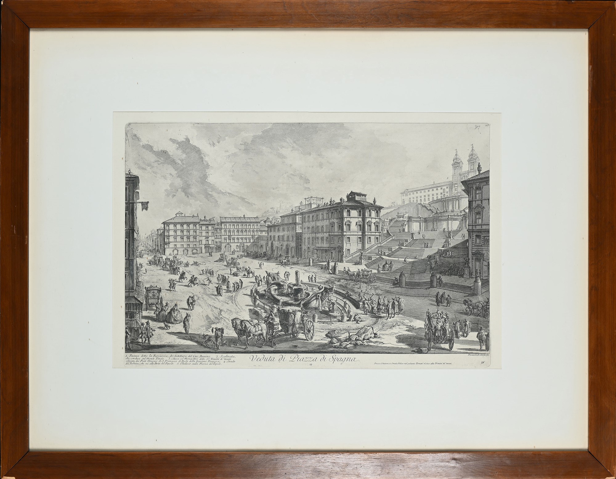 Giovan Battista Piranesi - Veduta di Piazza di Spagna (Calcografia nazionale) Tratta dalla raccolta di "Vedute di Roma disegnate ed incise da Giambattista Piranesi Architetto veneziano". Ristampa della Calcografia nazionale. Entro cornice di legno moderna color noce cm 80,5x102 Incisione su carta Calcografia nazionale, XX secolo cm 40,5x60