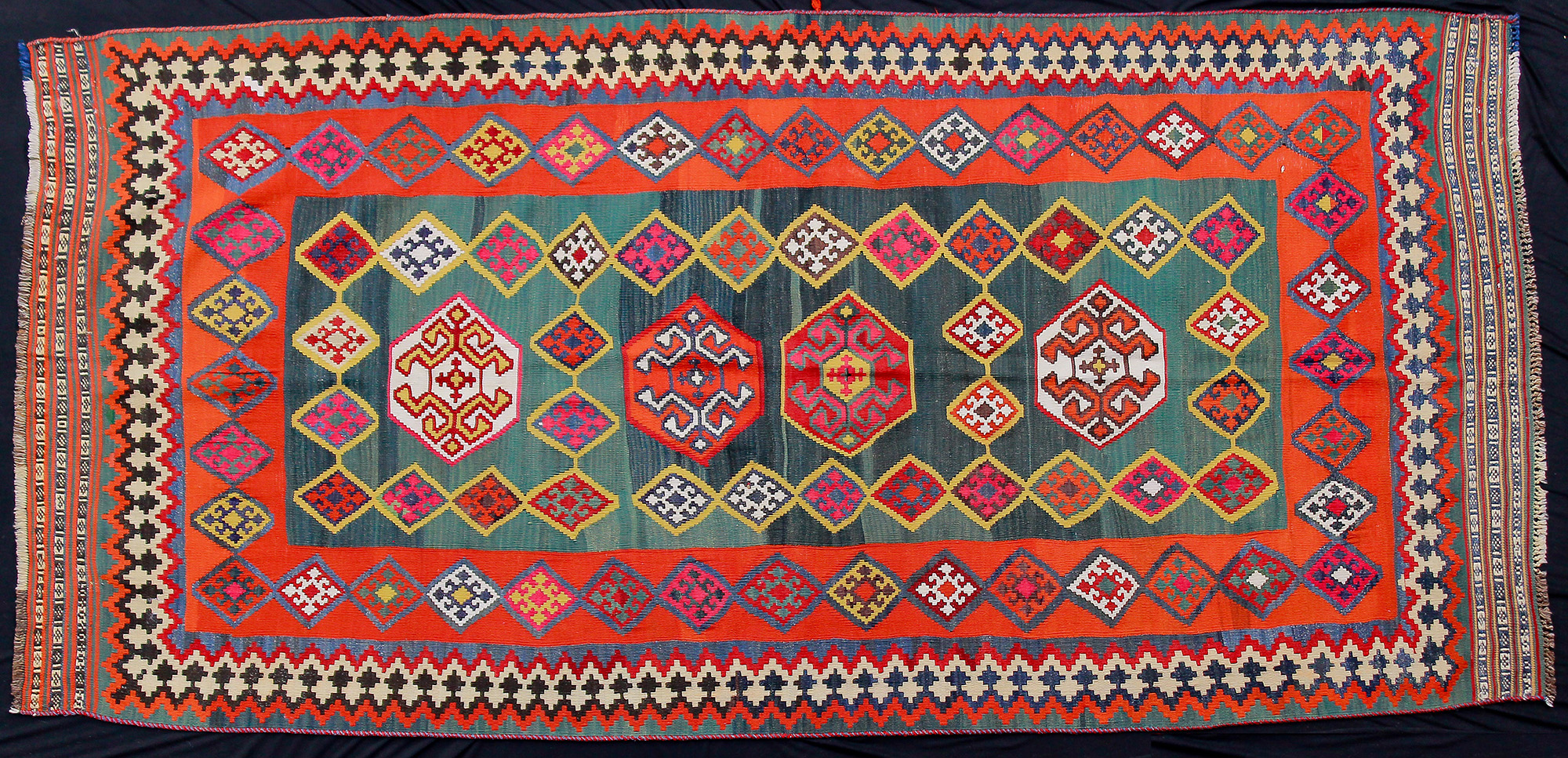 Precedente Lotto 0056 Successivo Casa d'Aste Martini - C.so Cavallotti 76, 18038 Sanremo ASTA ICONE E TAPPETI ORIENTALI Sessione unica martedì 19 dicembre 2023 ore 15:00 (UTC +01:00) TAPPETO Tappeto Kilim Qashqay Persia colori vegetali naturalicm. 280x133