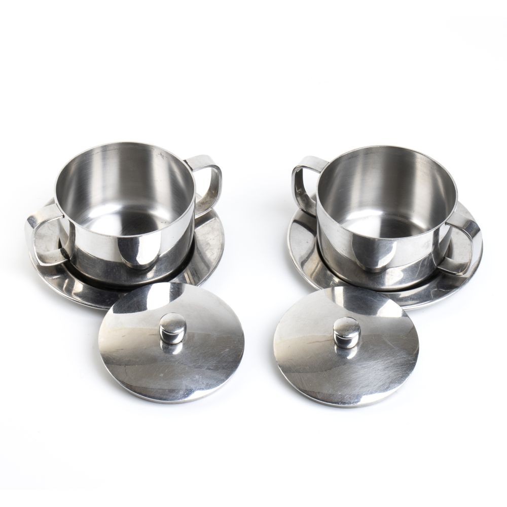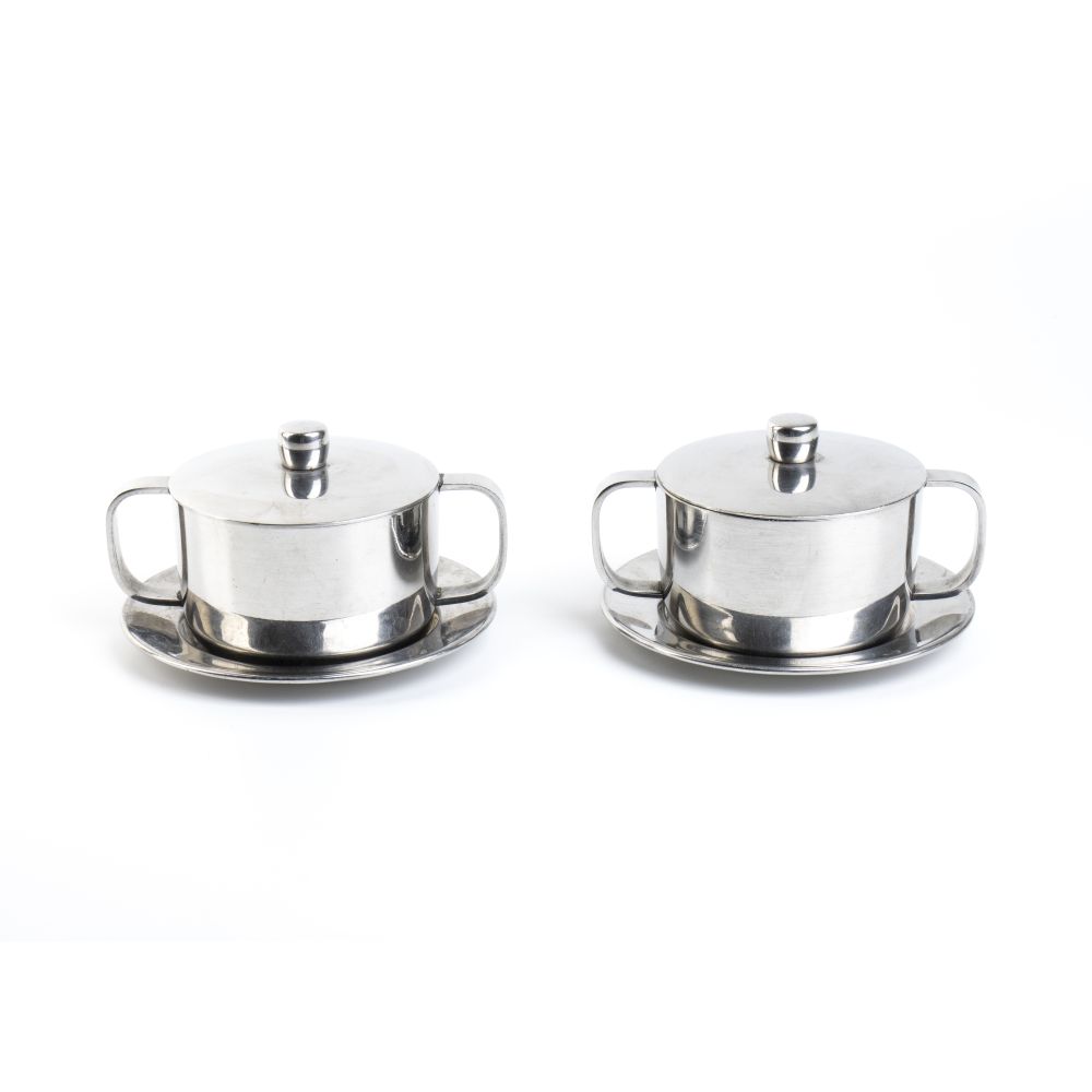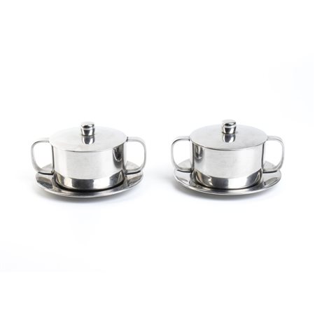 due zuccheriere delle Krupp disegnate da Gio Ponti complete di piattino in ottime condizioni, larghezza con i manici circa 12 cm, altezza con pomello di circa 7 cm, diametro piattino 11 cm