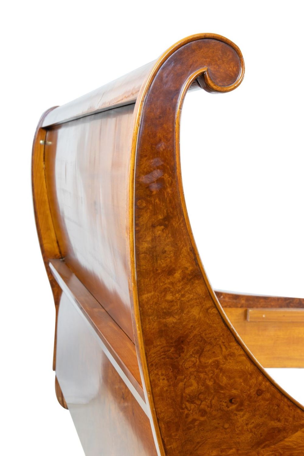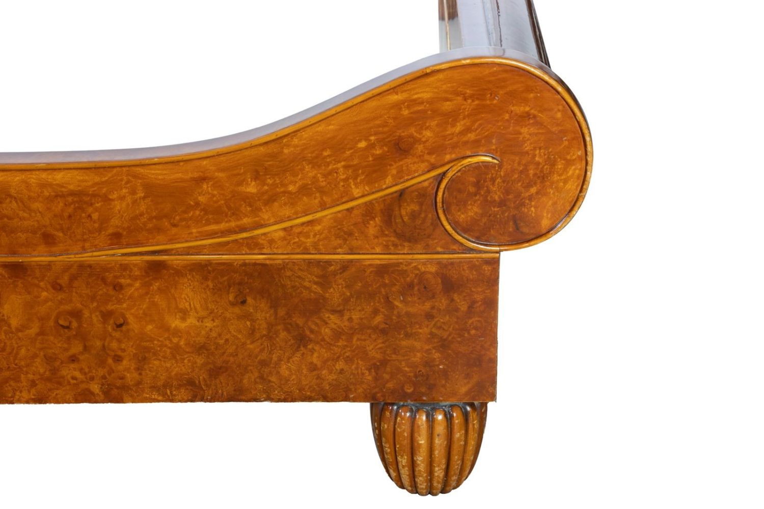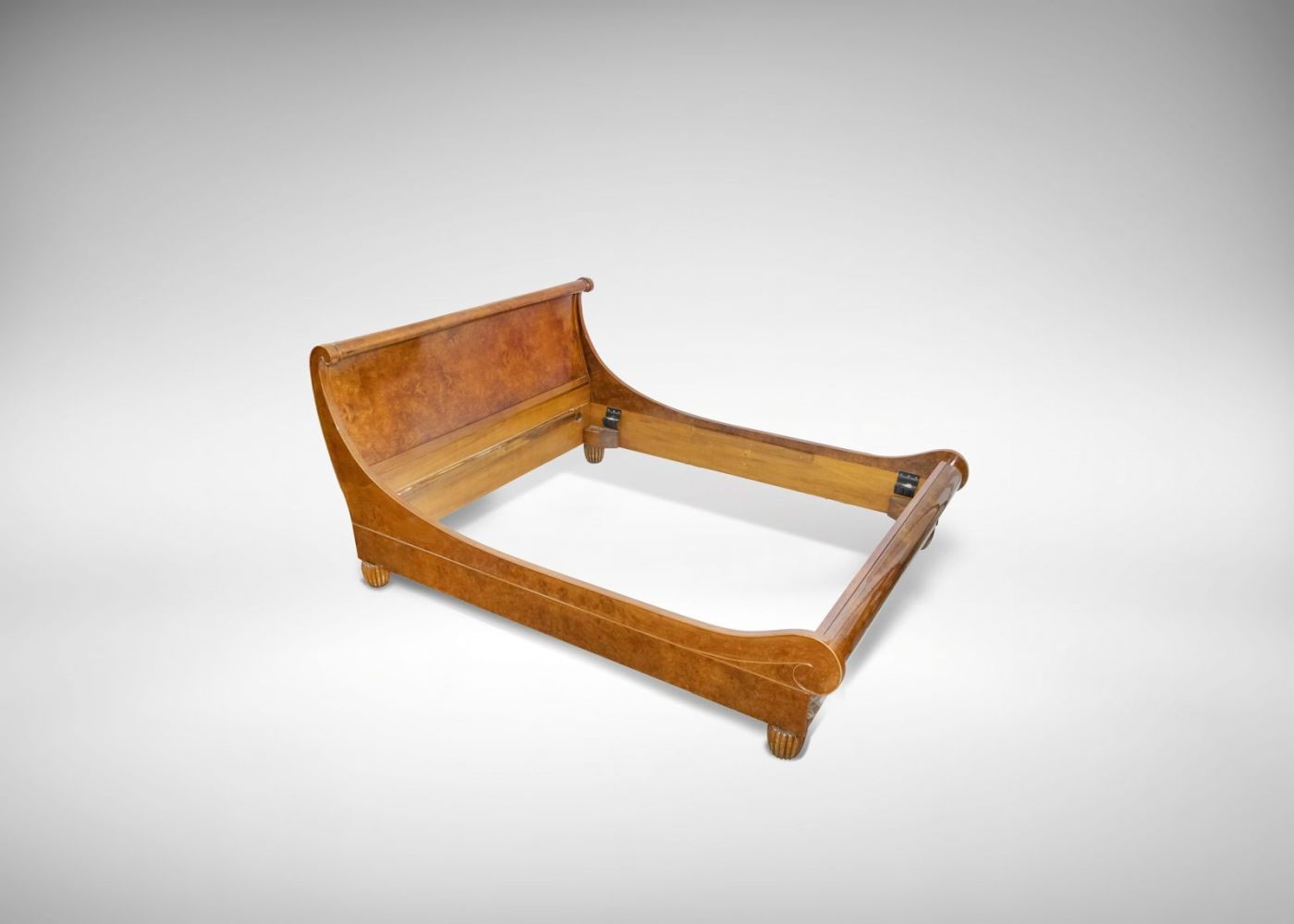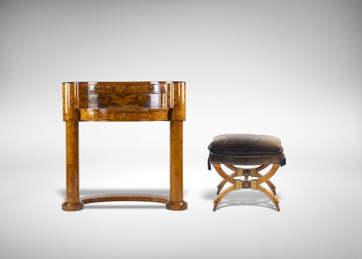 Un'elegante camera da letto Biedermaier, attribuita a Joseph Ulrich Danhauser. Noce, pelle, metallo brassa. In ottime condizioni e comprendente camera da letto (cm 110 x 230 x 183), scrivania (cm 60x42x60), sgabello, consolle (cm 85 x 45 x 109) e 2 comodini. Joseph Ulrich Danhauser ( 14 marzo 1780 a Vienna; † 9 gennaio 1829 a Vienna) fu un produttore di mobili sul Wieden, vicino a Vienna, durante il periodo Biedermeier. Dopo una formazione come scultore all'Accademia di Belle Arti, Joseph Ulrich Danhauser fondò nel 1804 l'"Etablissement for all objects of ameublements", dove offriva mobili, tendaggi, tappezzerie, tappeti e articoli in bronzo e vetro. Il Palais Czernin (occasionalmente chiamato anche Palais Czernin-Althan) nella Favoritenstrasse gli servì come stabilimento di produzione, la maggior parte del cui giardino fu venduta come terreno edificabile. Nel nostro laboratorio, dove già intorno al 1808 lavoravano più di 100 persone, si producevano Nel nostro laboratorio, dove già intorno al 1808 lavoravano 100 persone, venivano realizzati su disegno mobili, lampade, telai per pipe, fucili e stecche da biliardo, telai da ricamo, schermi per stufe, pulpiti e altari. La pasta da lui sviluppata, con la quale era in grado di imitare il bronzo come decorazione di mobili e altri arredi, ebbe molto successo. Nel 1812, la Hofkammer gli concesse il privilegio esclusivo di produrli. Vista la grande richiesta dei suoi prodotti, che offrivano una soluzione totale per la progettazione dello spazio abitativo, furono aperte filiali a Graz e Budapest. Inoltre, i clienti potevano scegliere gli arredi per i loro appartamenti o case dai cataloghi. Tra gli indirizzi più importanti che vennero arredati con i suoi prodotti vi furono il Palais Archduke Albrecht (l'attuale Albertina), il Weilburg a Baden, il Palazzo Laxenburg vicino a Vienna, il Geymüllerschlössel a Vienna e parti del Castello di Graz. Dopo la morte di Josef Ulrich Danhauser, la fabbrica fu portata avanti dalla vedova di Danhauser, che andò in bancarotta nel 1834. La fabbrica fu poi rilevata dal figlio Franz, che fallì nel 1841. I locali della fabbrica furono in seguito utilizzati dall'Ospedale Wiedner. Ospedale Wiedner. I mobili da salotto realizzati da Danhauser sono esposti nella mostra permanente del MAK di Vienna. La Biblioteca e la Collezione di opere su carta del MAK possiedono l'intero patrimonio di disegni della fabbrica di mobili (circa 2.500 fogli), che sono stati digitalizzati nel 2008 e registrati in un database.