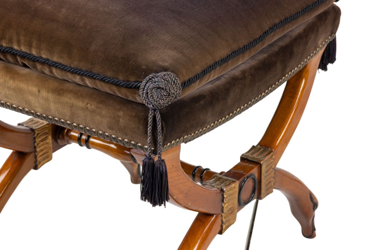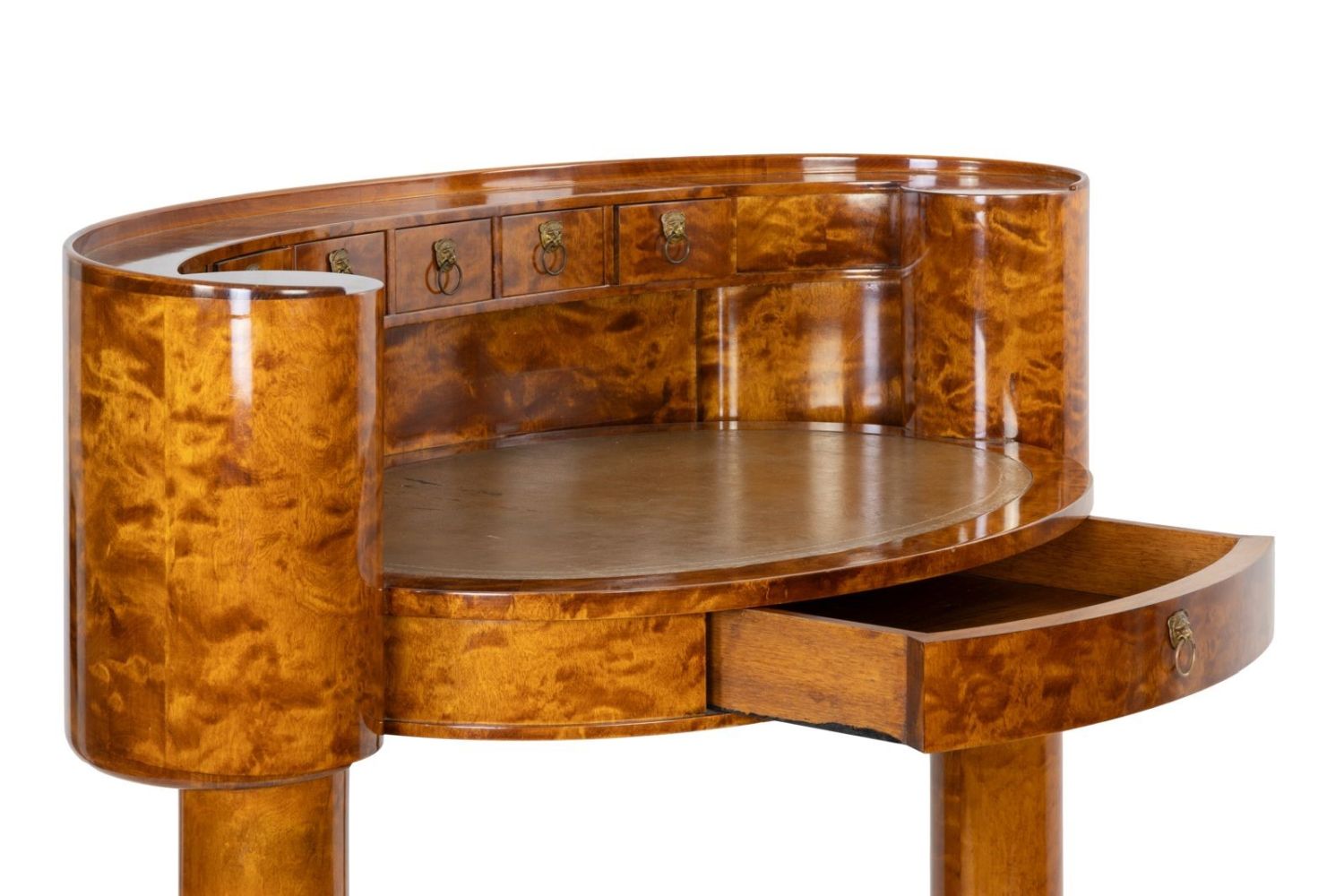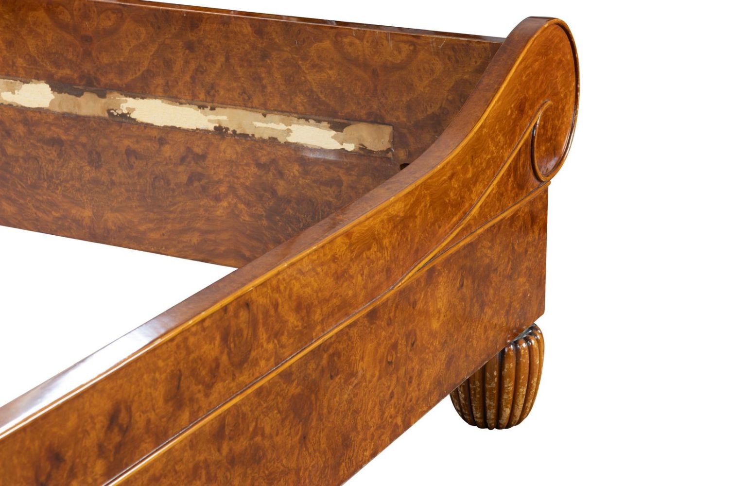 Un'elegante camera da letto Biedermaier, attribuita a Joseph Ulrich Danhauser. Noce, pelle, metallo brassa. In ottime condizioni e comprendente camera da letto (cm 110 x 230 x 183), scrivania (cm 60x42x60), sgabello, consolle (cm 85 x 45 x 109) e 2 comodini. Joseph Ulrich Danhauser ( 14 marzo 1780 a Vienna; † 9 gennaio 1829 a Vienna) fu un produttore di mobili sul Wieden, vicino a Vienna, durante il periodo Biedermeier. Dopo una formazione come scultore all'Accademia di Belle Arti, Joseph Ulrich Danhauser fondò nel 1804 l'"Etablissement for all objects of ameublements", dove offriva mobili, tendaggi, tappezzerie, tappeti e articoli in bronzo e vetro. Il Palais Czernin (occasionalmente chiamato anche Palais Czernin-Althan) nella Favoritenstrasse gli servì come stabilimento di produzione, la maggior parte del cui giardino fu venduta come terreno edificabile. Nel nostro laboratorio, dove già intorno al 1808 lavoravano più di 100 persone, si producevano Nel nostro laboratorio, dove già intorno al 1808 lavoravano 100 persone, venivano realizzati su disegno mobili, lampade, telai per pipe, fucili e stecche da biliardo, telai da ricamo, schermi per stufe, pulpiti e altari. La pasta da lui sviluppata, con la quale era in grado di imitare il bronzo come decorazione di mobili e altri arredi, ebbe molto successo. Nel 1812, la Hofkammer gli concesse il privilegio esclusivo di produrli. Vista la grande richiesta dei suoi prodotti, che offrivano una soluzione totale per la progettazione dello spazio abitativo, furono aperte filiali a Graz e Budapest. Inoltre, i clienti potevano scegliere gli arredi per i loro appartamenti o case dai cataloghi. Tra gli indirizzi più importanti che vennero arredati con i suoi prodotti vi furono il Palais Archduke Albrecht (l'attuale Albertina), il Weilburg a Baden, il Palazzo Laxenburg vicino a Vienna, il Geymüllerschlössel a Vienna e parti del Castello di Graz. Dopo la morte di Josef Ulrich Danhauser, la fabbrica fu portata avanti dalla vedova di Danhauser, che andò in bancarotta nel 1834. La fabbrica fu poi rilevata dal figlio Franz, che fallì nel 1841. I locali della fabbrica furono in seguito utilizzati dall'Ospedale Wiedner. Ospedale Wiedner. I mobili da salotto realizzati da Danhauser sono esposti nella mostra permanente del MAK di Vienna. La Biblioteca e la Collezione di opere su carta del MAK possiedono l'intero patrimonio di disegni della fabbrica di mobili (circa 2.500 fogli), che sono stati digitalizzati nel 2008 e registrati in un database.