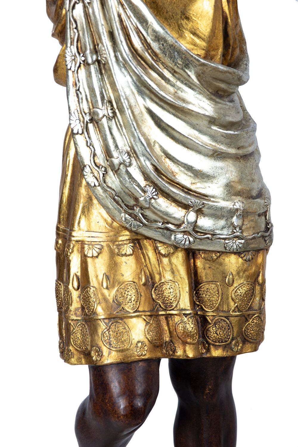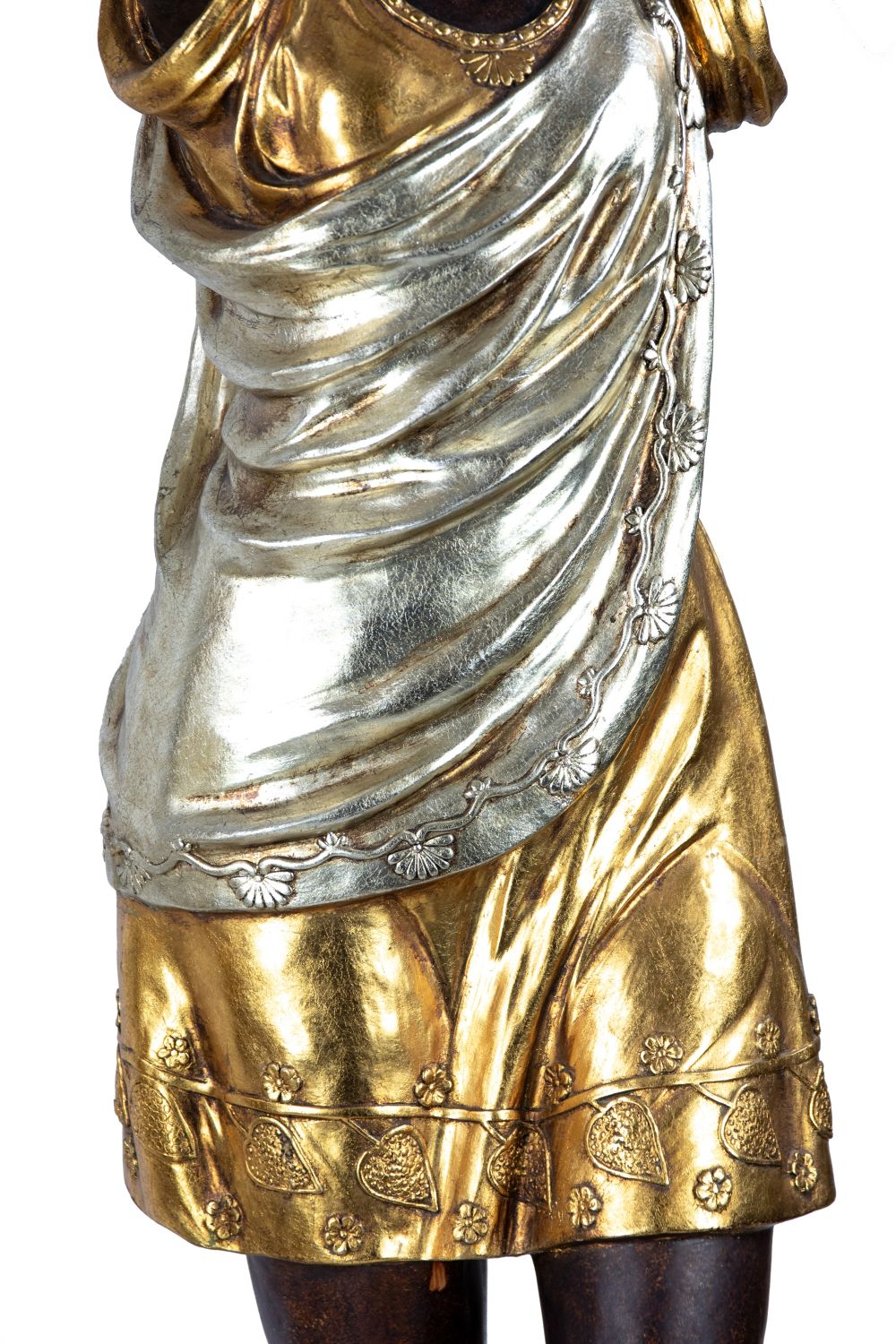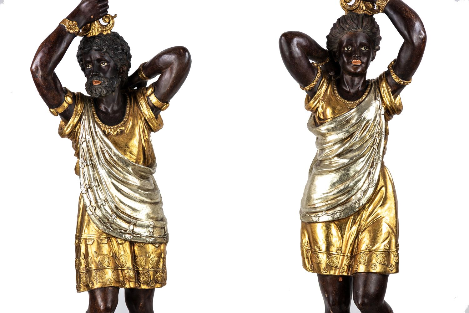 Le statue rappresentano due Mori coloniali (in scala 1 a 1) che reggono un candelabro scolpito elettrificato con 10 luci. Le statue sono su un piedistallo (43 x 46 cm). Lievi segni d'età.
