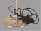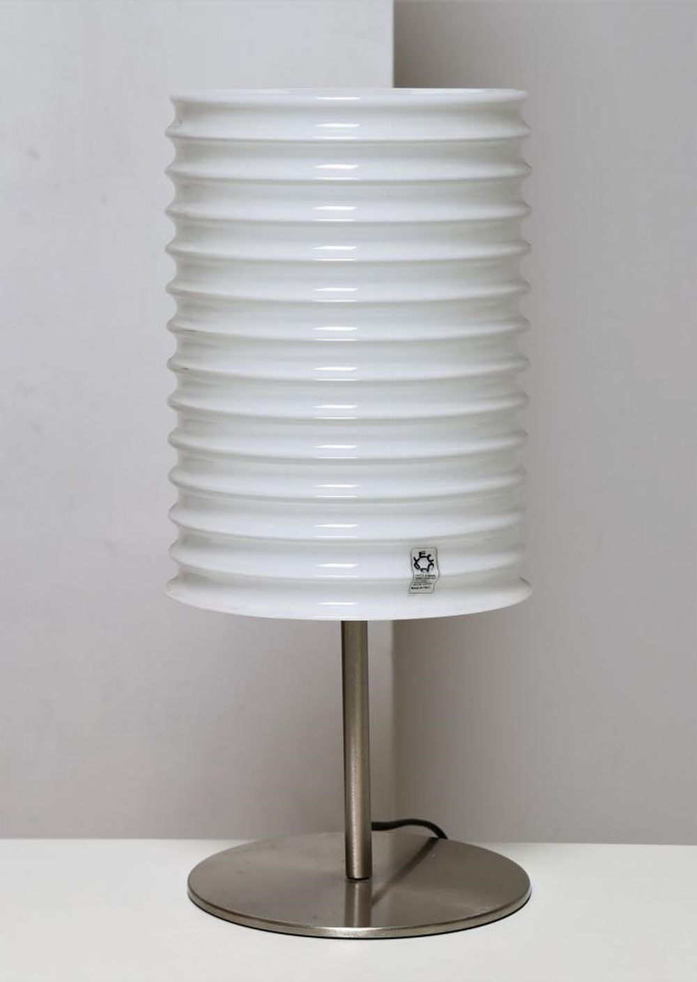 Lampada da tavolo circolare realizzata a mano in metallo cromato e vetro. Etichetta originale dell'azienda.