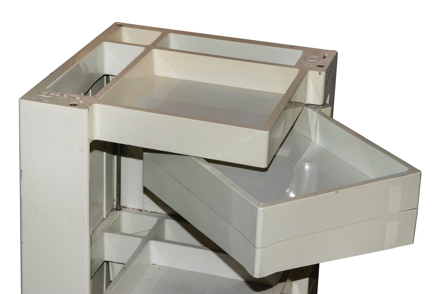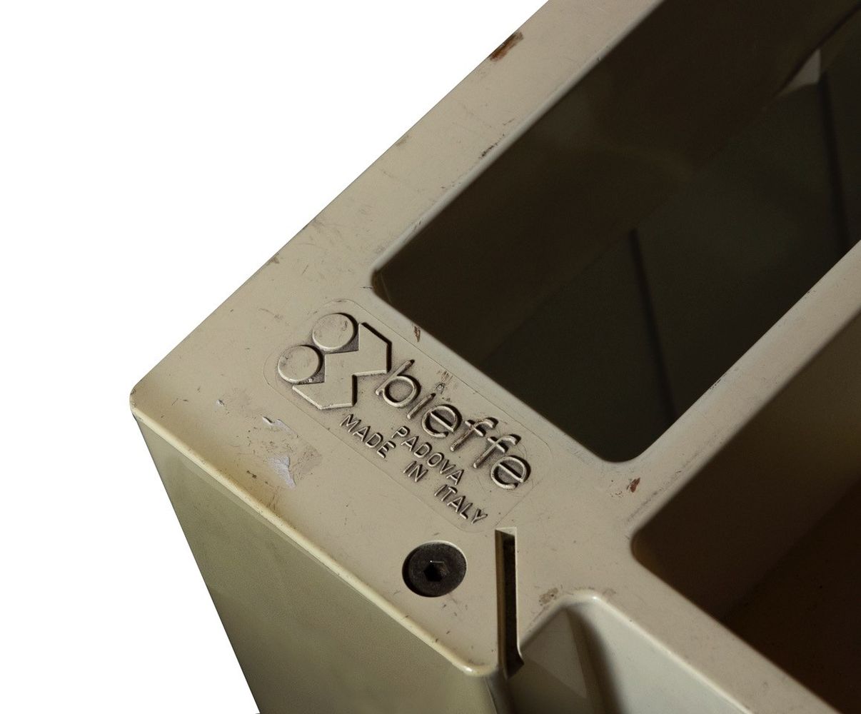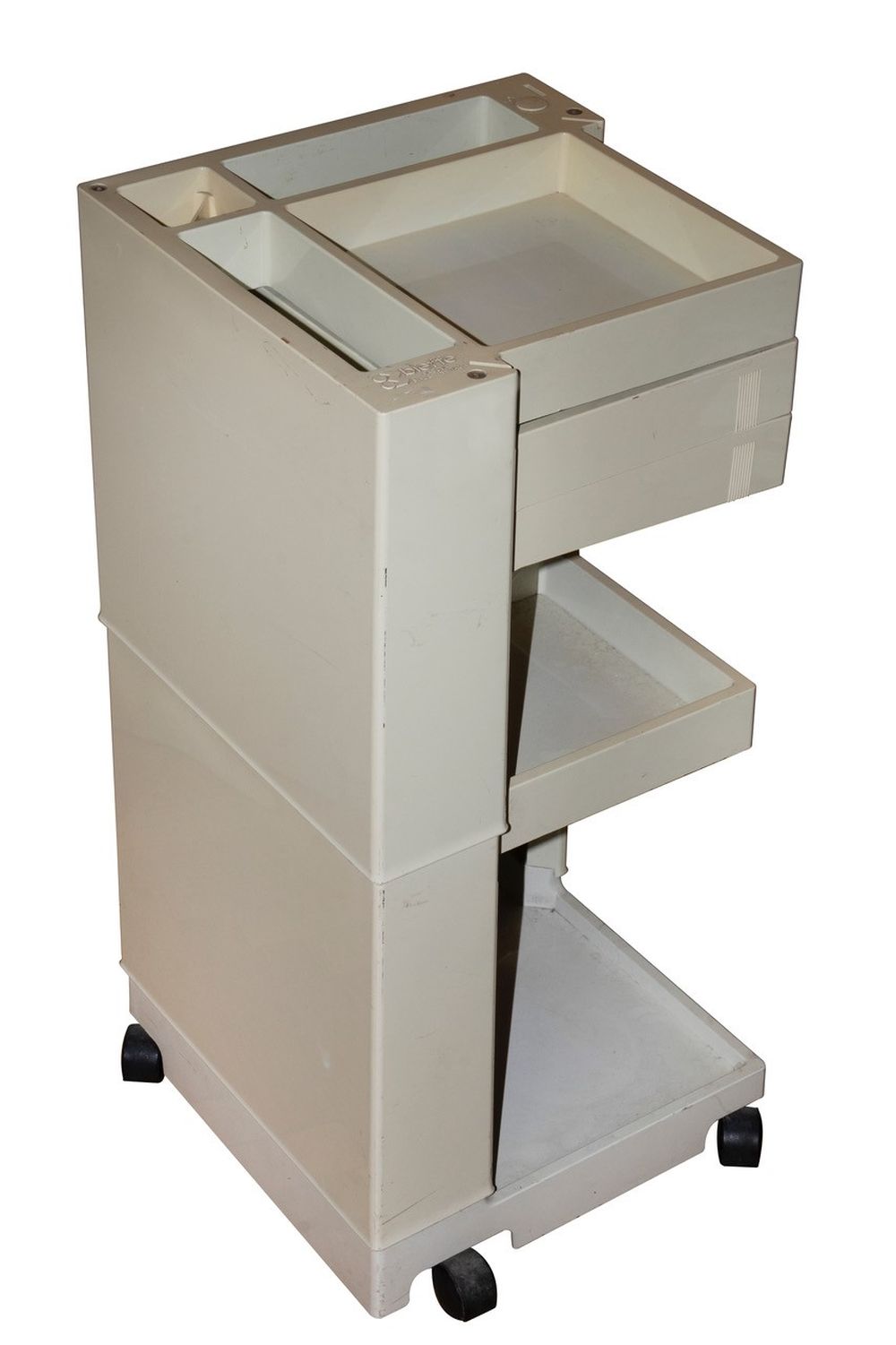 Disegnato da Joe Colombo per B-line, questo carrello ha struttura e cassetti in materiale plastico ABS stampato a iniezione. Tiranti, viti e perni in acciaio zincato. Ruote in polipropilene.