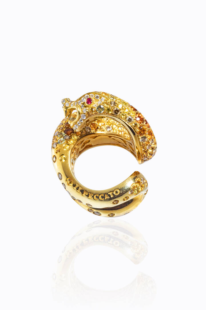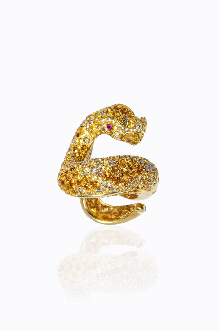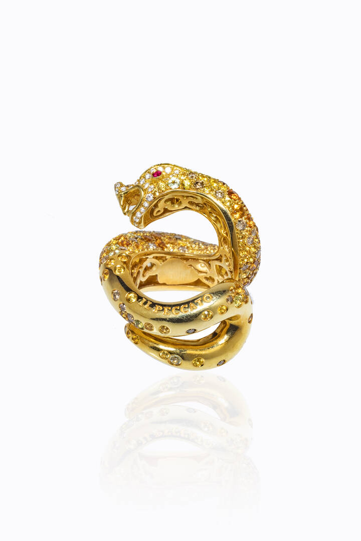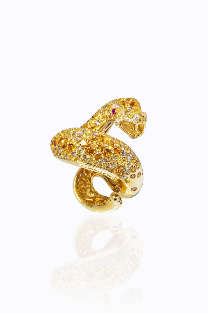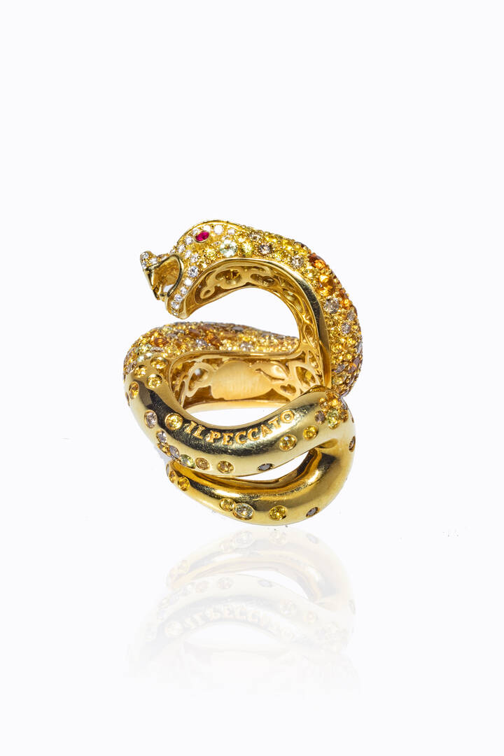 Importante anello in oro giallo, firmato “Pasquale Bruni”, a forma di serpente, modello "il peccato" interamente in pavé di diamanti taglio brillante di colore bianco e cognac per totali ct 2,01 ca, zaffiri gialli per totali ct 3,26 ca. Due rubini come occhi.