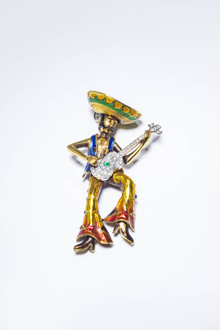 Spilla in oro giallo e bianco, firmata "Damiani", serie i "Suonatori", a forma di suonatore di chitarra messicano, in smalto policromo e diamanti taglio 8/8 per totali ct 0,80 ca.