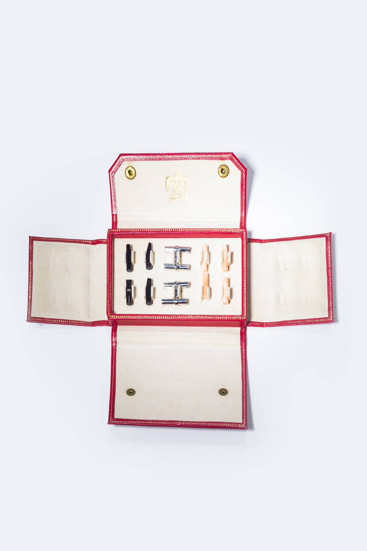 Set di gemelli in oro bianco con barrette intercambiabili in corallo rosa ed onice. Firmati "Cartier".