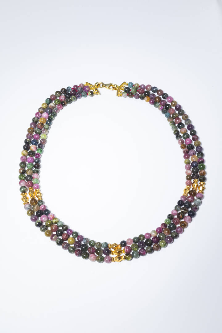 composto da tre fili di tormaline nei toni del verde, del viola e del rosa. Chiusura e distanziali in argento dorato.