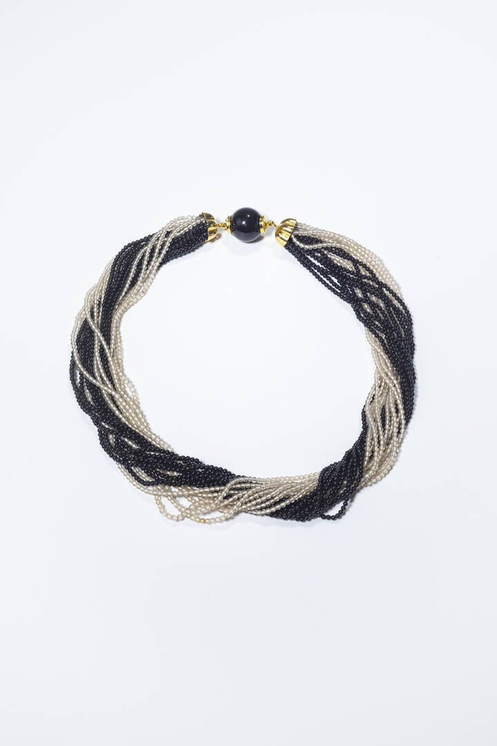 composto da diciotto fili di sfere di quarzo bianco e di onice, lavorato a torchon. Chiusura con sfera di onice ed oro giallo.