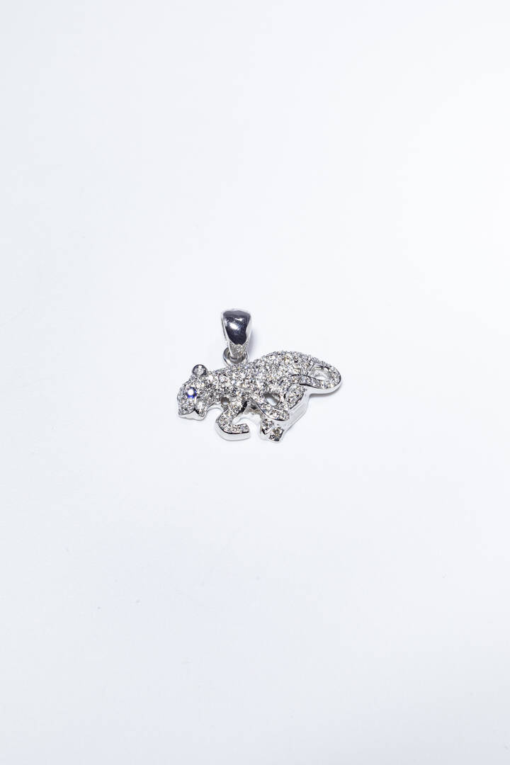 in oro bianco, a forma di pantera, con pavé di diamanti taglio brillante per totali ct 0,50 ca e piccolo zaffiro come occhio.