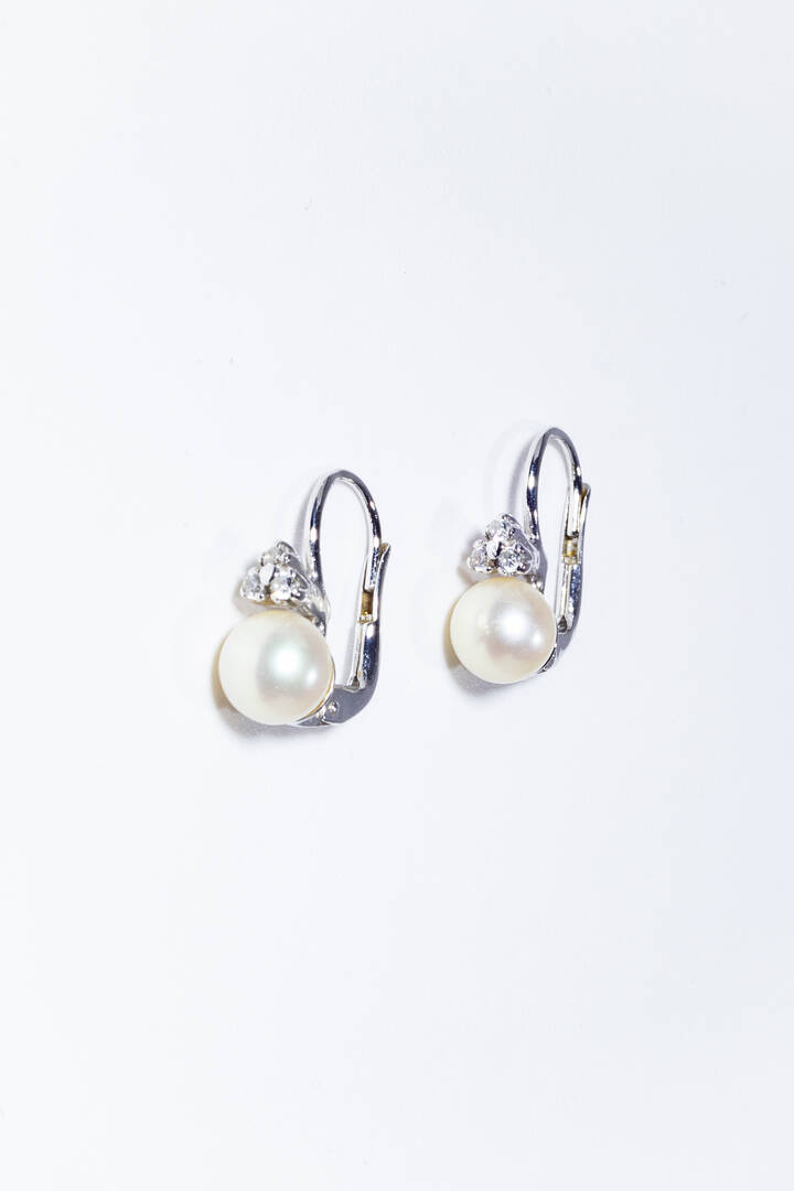 in oro bianco, a monachella, con perline giapponesi del diam. mm 7,0 ca e sei diamanti taglio brillante per totali ct 0,10 ca.