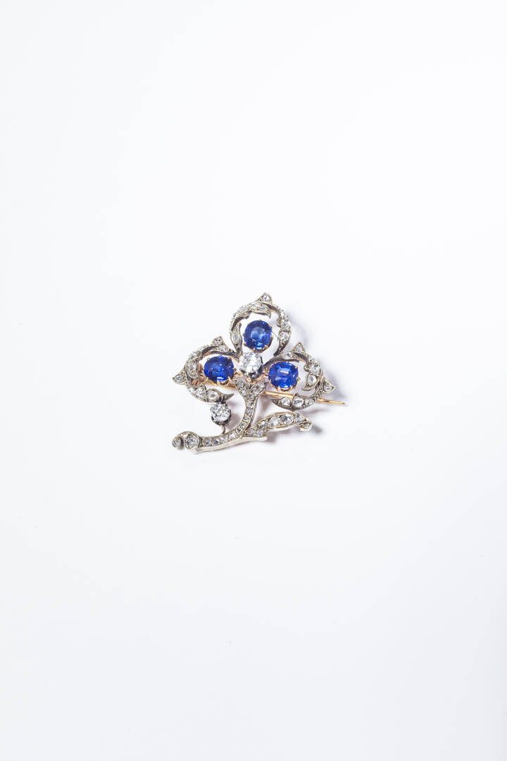 in oro rosa a bassa caratura ed argento, XIX secolo, a forma di trifoglio, con rosette e diamanti taglio vecchio per totali ct 0,60 ca e tre zaffiri taglio ovale per totali ct 2,80 ca.