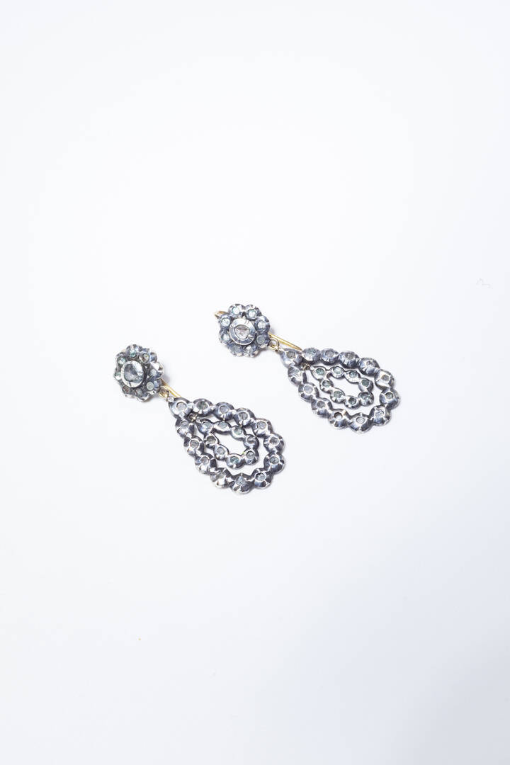 in oro a bassa caratura ed argento, XVIII secolo, con gocce in rosette di diamanti per totali ct 0,60 ca.