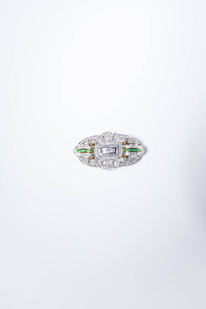 in oro bianco, in stile Déco, di forma rettangolare con angoli ovalizzati con diamanti taglio brillante e princess per totali ct 1,30 ca e smeraldi taglio carré per totali ct 0,25 ca.