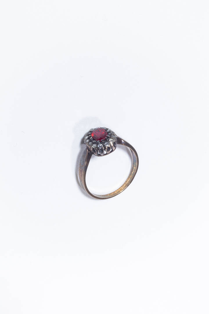 in oro rosa a bassa caratura, XIX secolo, al centro gemma rossa e contorno di rosette.