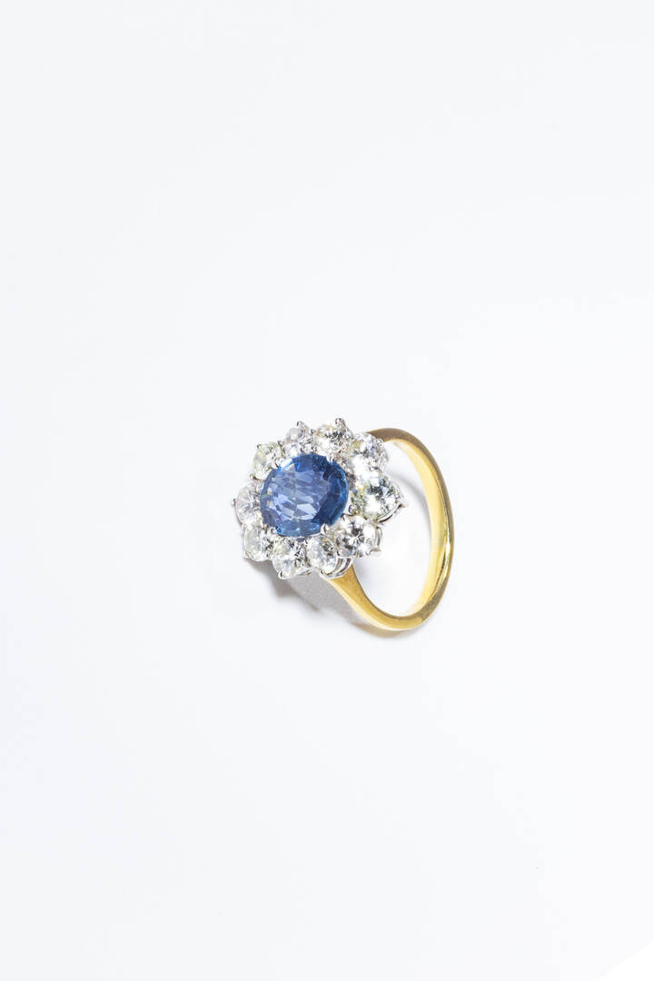 in oro bianco e giallo, sommità a margherita con al centro zaffiro taglio ovale di ct 3,50 ca, contornato da diamanti taglio brillante per totali ct 2,30 ca, probabile colore G-H, purezza IF-VVS.