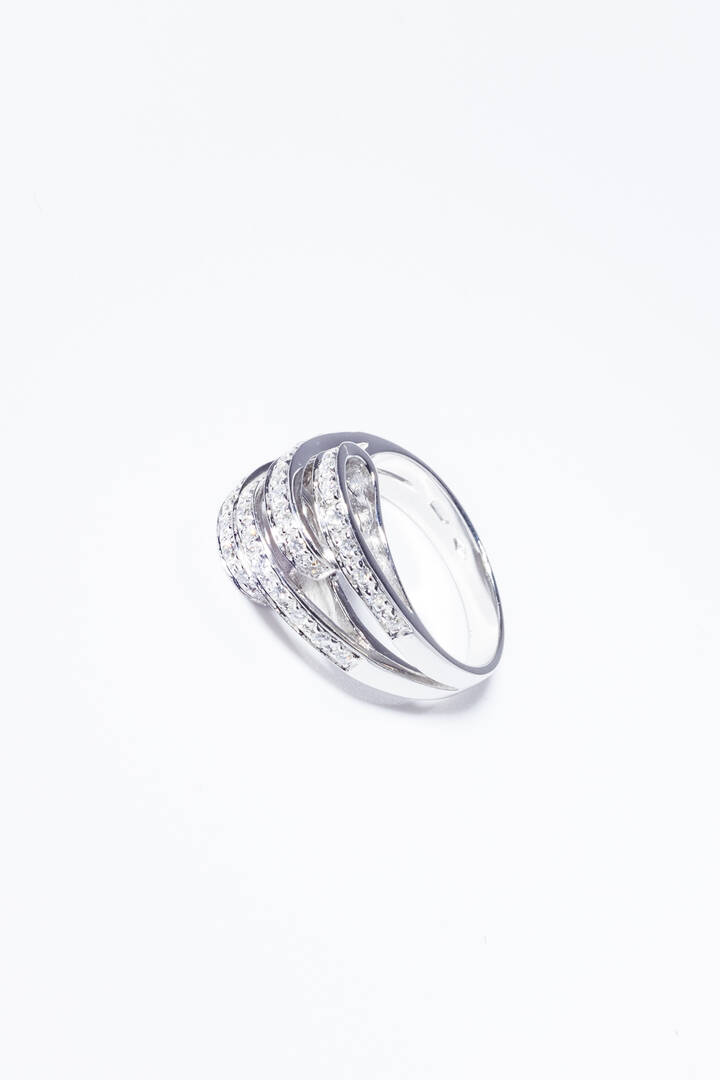 in oro bianco, sommità a volute intrecciate con diamanti taglio brillante per totali ct 0,40 ca, probabile colore G-H, purezza IF-VVS.