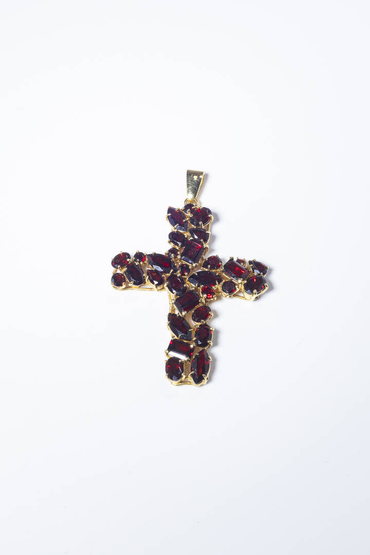 in oro giallo 9 Kt, a forma di croce, con granati taglio fantasia.