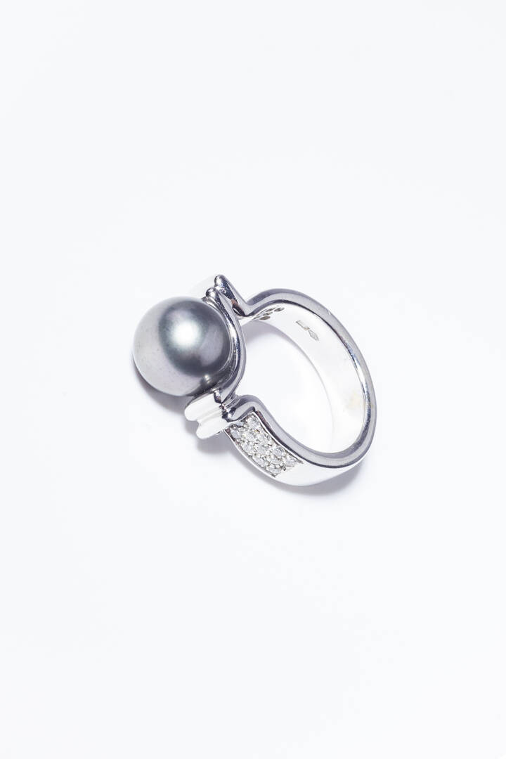 Anello in oro bianco, firmato "Salvini" con perla centrale Tahiti del diam. di mm 10,7 ca e diamanti taglio brillante per totali ct 0,35 ca, probabile colore G-H, purezza IF-VVS.