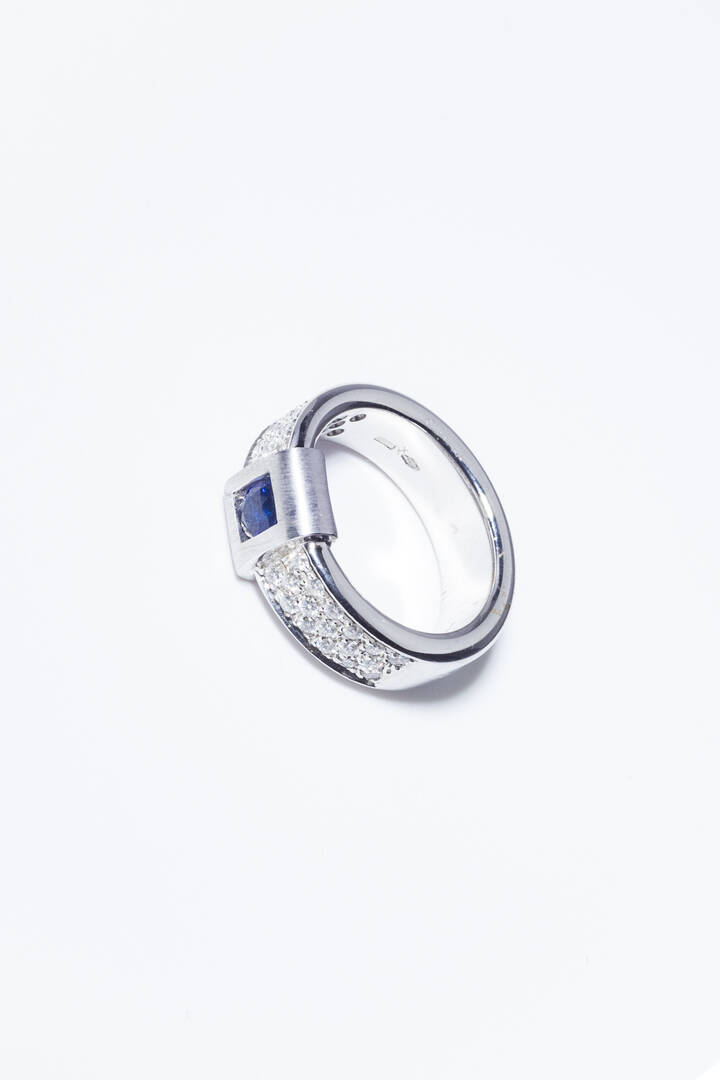Anello in oro bianco, firmato "Salvini", al centro uno zaffiro di ct 0,30 ca e diamanti taglio brillante per totali ct 0,35 ca, probabile colore G-H, purezza IF-VVS.