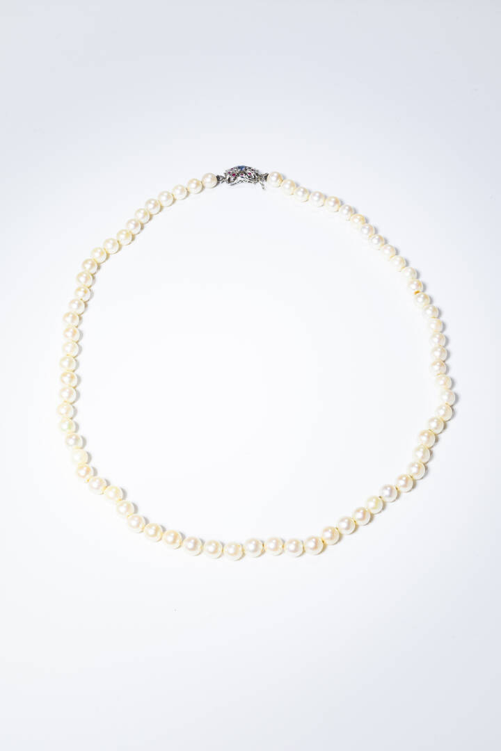 composto da un filo di perle giapponesi del diam. di mm. 7,5 ca. Chiusura in oro bianco con gemme sintetiche.