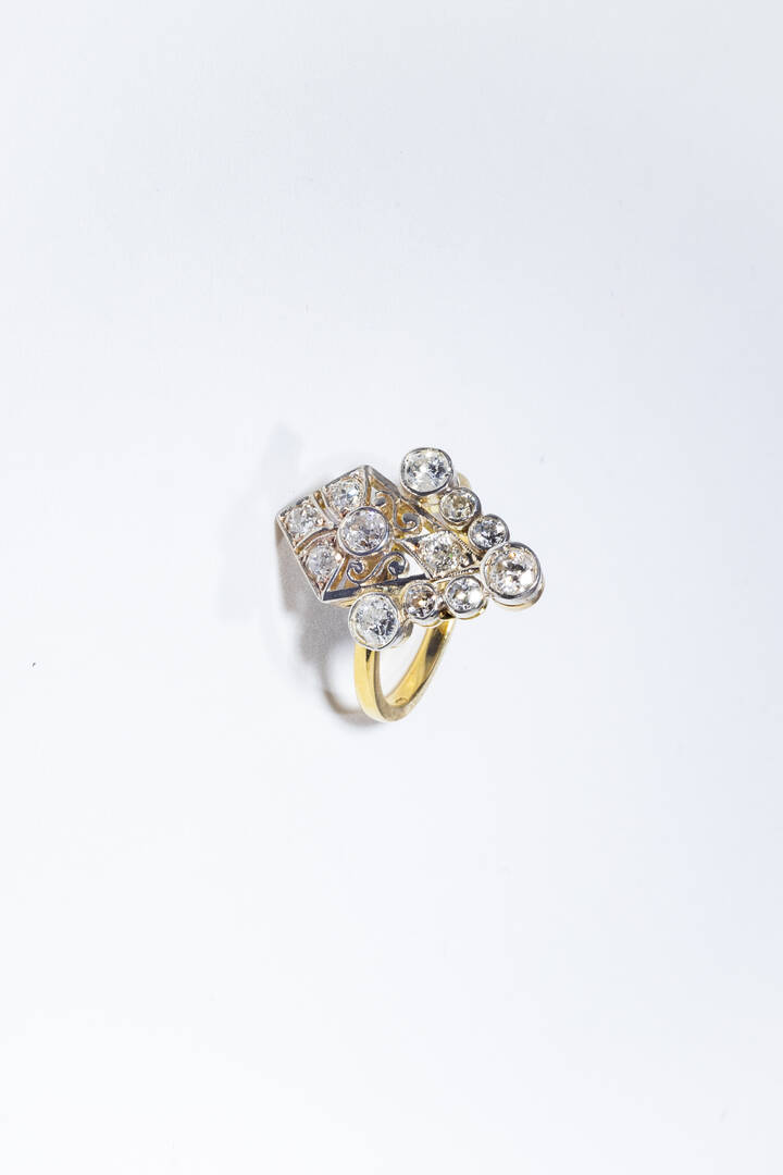 in oro giallo, sommità a voluta in oro bianco con diamanti di vecchio taglio per totali ct 0,90 ca.