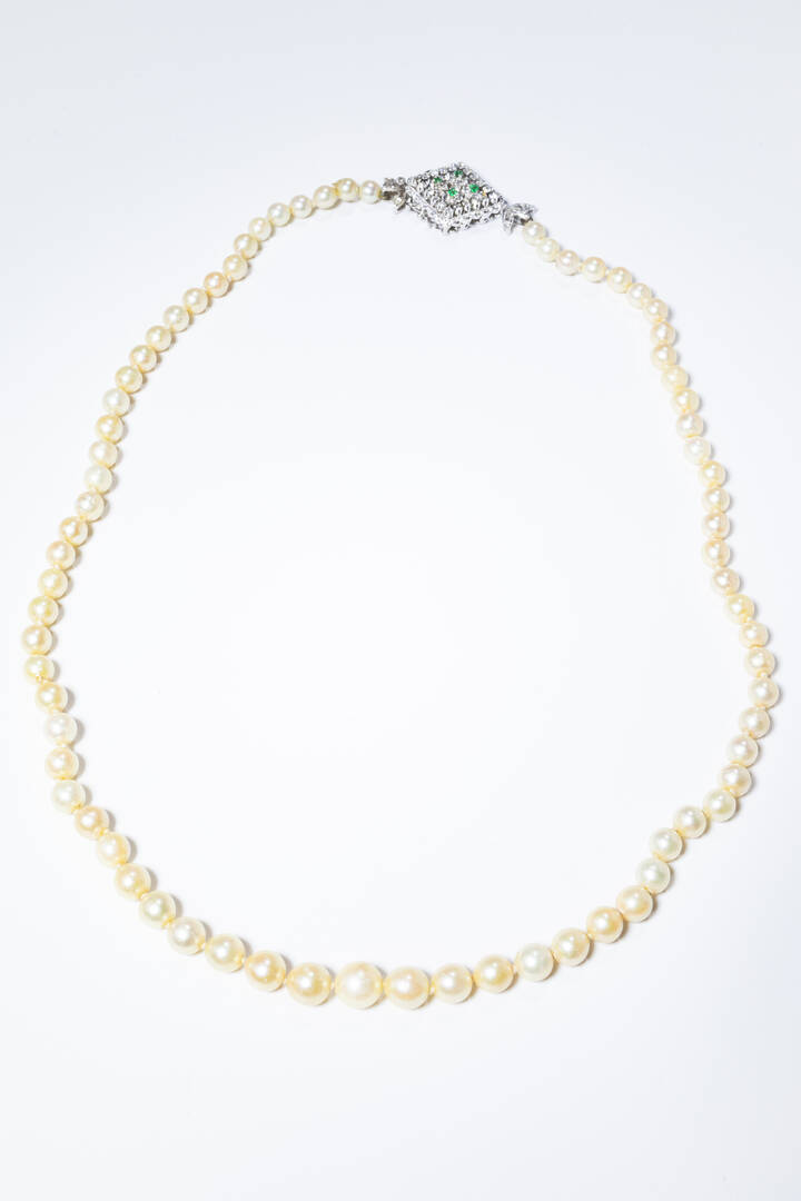composto da un filo di perle giapponesi a scalare dal diam. di mm 5 a 8,5 ca. Chiusura geometrica in oro bianco con smeraldini e diamanti taglio 8/8. Una perla aggiuntiva.