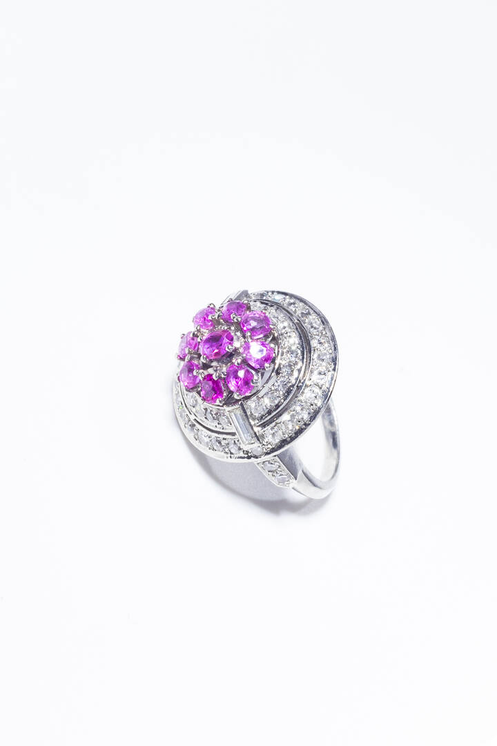in platino, anni '40, sommità rotonda con rubini taglio rotondo per totali ct 1,30 ca e doppio contorno di diamanti taglio 8/8 e baguette per totali ct 1,70 ca