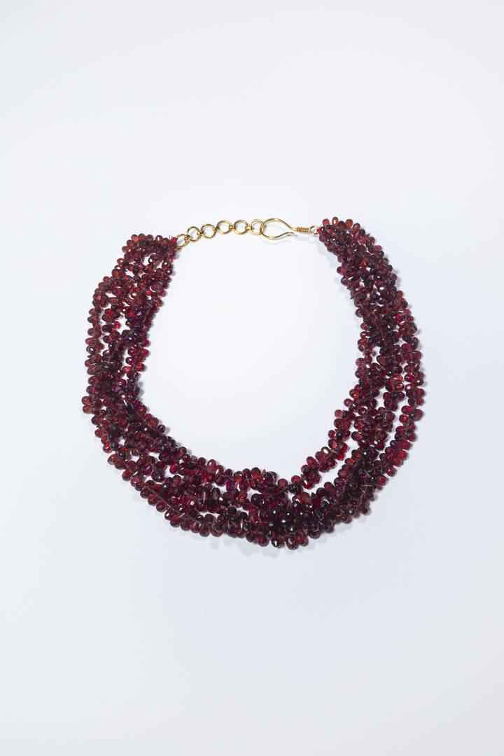 composto da tre fili di granati a goccia briolette. Chiusura in oro giallo.