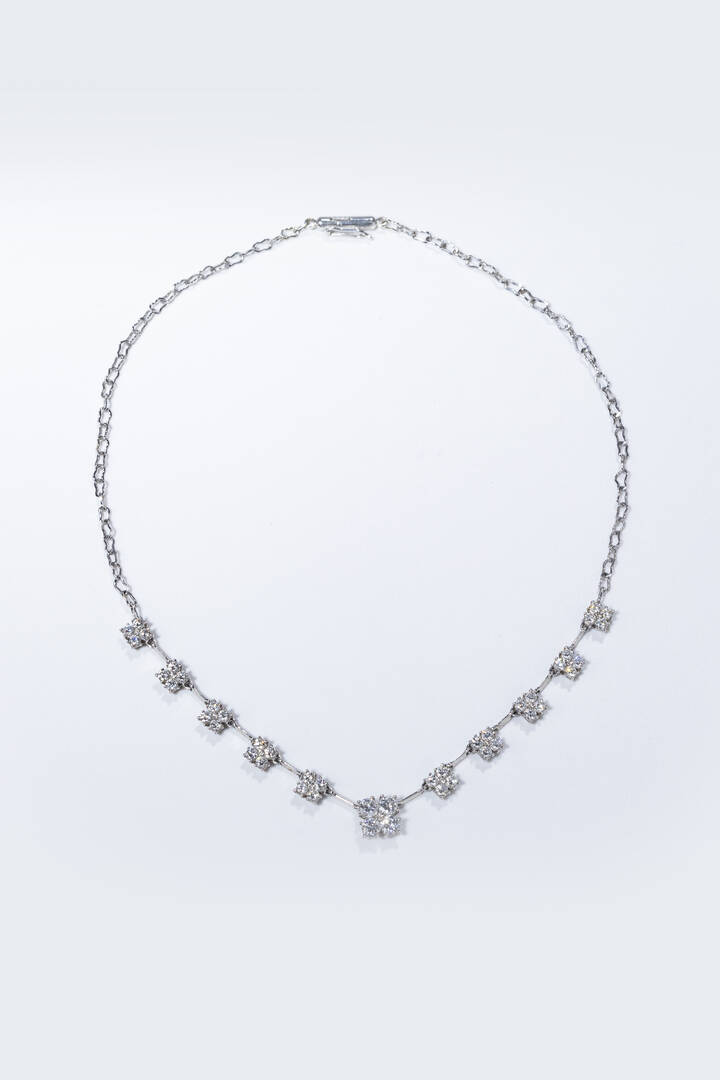 in oro bianco, composto da quadrifogli stilizzati in diamanti taglio brillante per totali ct 2,0 ca, probabile colore G-H, purezza IF-VVS.