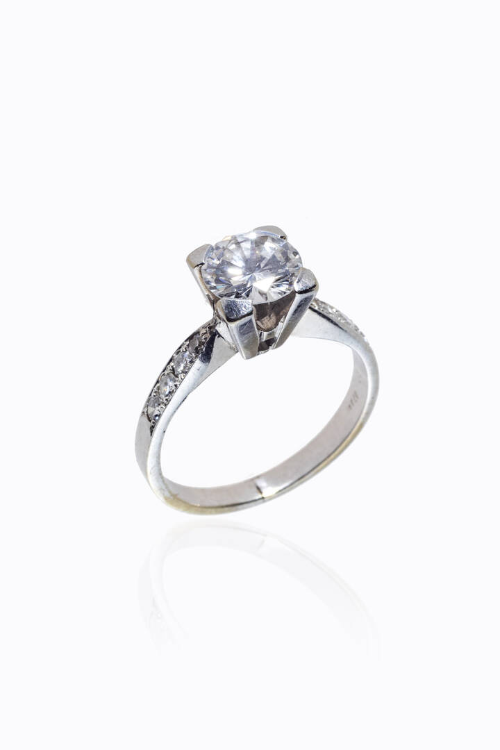 in oro bianco con diamante taglio brillante di ct 1, 0 ca, probabile colore H, purezza VS1e lungo il gambo diamanti a decoro