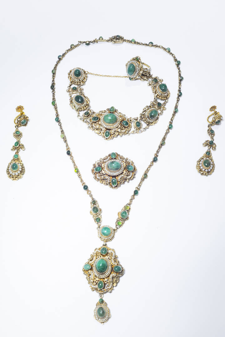 in argento dorato, XIX secolo, composta da girocollo, bracciale, anello, orecchini e spilla con perline e smeraldi cabochon per totali ct 50 ca.