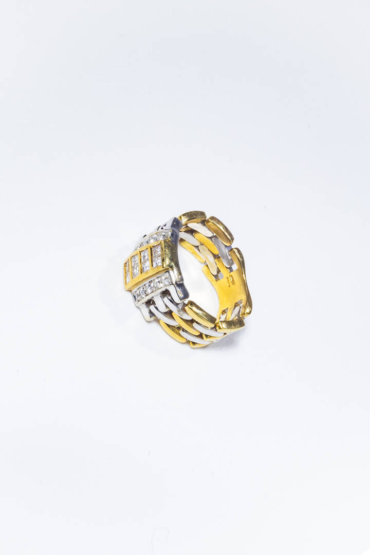 in oro giallo e bianco, a maglia panthere morbida, al centro diamanti taglio carré e brillante per totali ct 0,70 ca.