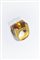 in oro giallo, struttura di forma geometrica, al centro grande quarzo citrino sfaccettato ed ai lati diamanti taglio brillante per totali ct 0,30 ca.