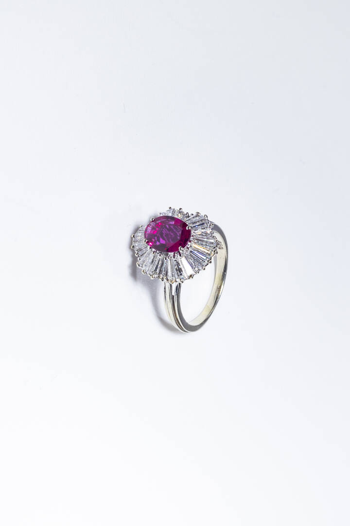 in oro bianco sommità a margherita con al centro rubino taglio ovale di ct 1,80 ca e contorno di diamanti taglio trapezio per totali ct 2,20 ca.