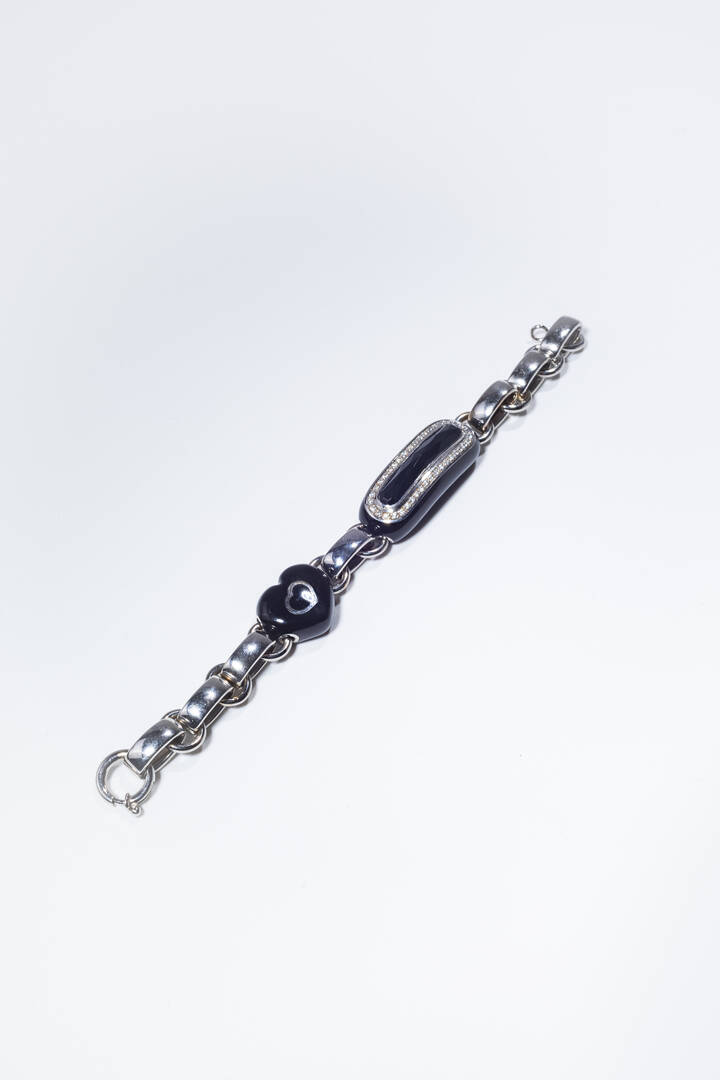 in oro bianco ed argento composto da anelli ovalizzati trattenenti un cuore ed un elemento ovale in smalto nero e onice sfaccettato. Diamanti taglio brillante a decoro per totali ct 0,40 ca.