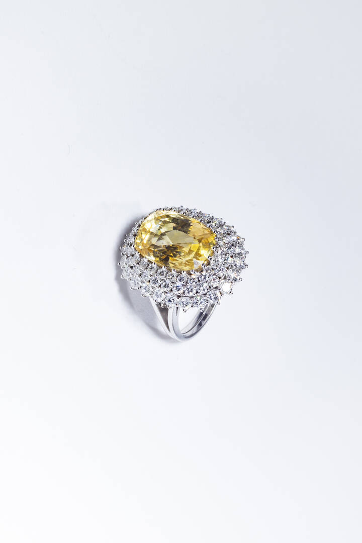 in oro bianco, al centro zaffiro taglio ovale giallo di ct 10,41 e triplo contorno di diamanti taglio brillante per totali ct 2,40 ca.