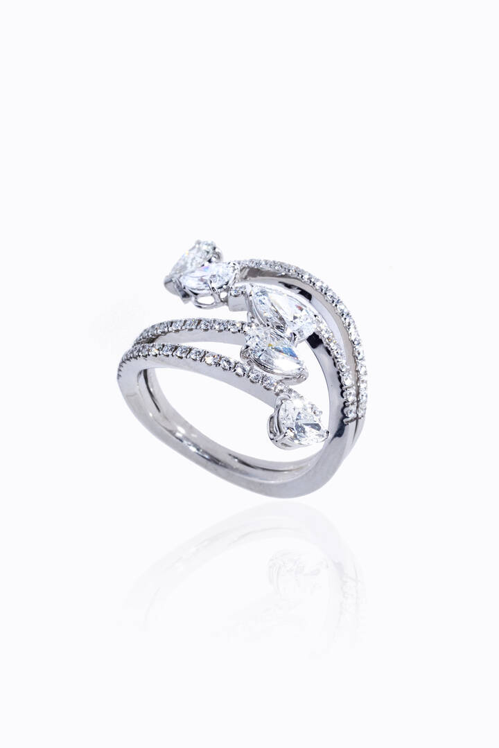 in oro bianco, sommità a contrarié, con quattro fasce in diamanti impreziosite da gocce di diamanti per totali ct 2,28 ca, probabile colore G-H, purezza IF-VVS.