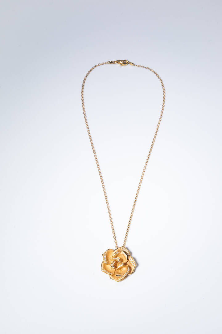 Ciondolo in oro rosa a forma di rosa satinata, firmata "Camilli", con diamanti taglio brillante per totali ct 0,30 ca, probabile colore G-H, purezza IF-VVS