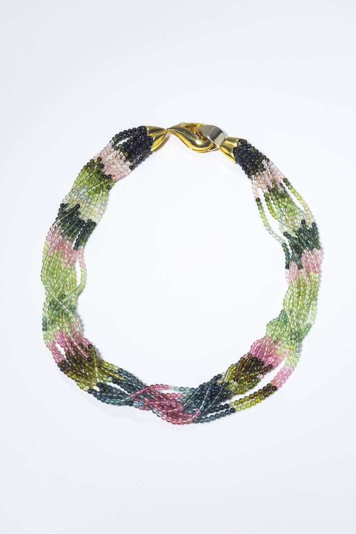 composto da dieci fili di sfere di tormaline di vari colori, lavorati a torchon. Chiusura in oro giallo.