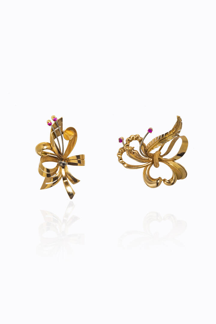 in oro rosa, anni '50, a forma di volute, con piccoli rubini.