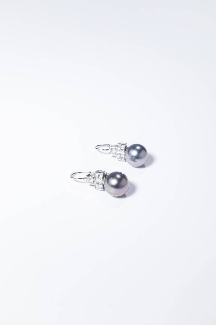 in oro bianco, a monachella, con due perle Tahiti del diam. di mm 10,7 ca, sormontate da sei diamanti taglio brillante per totali ct 0,70 ca, probabile colore G-H, purezza IF-VVS.