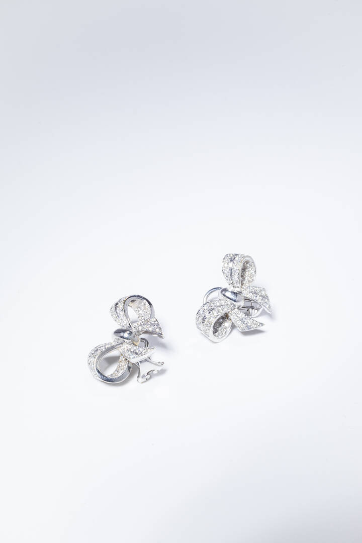 in oro bianco, a lobo, con due grandi fiocchi in diamanti taglio brillante per totali ct 1,25 ca, probabile colore G-H, purezza IF-VVS.