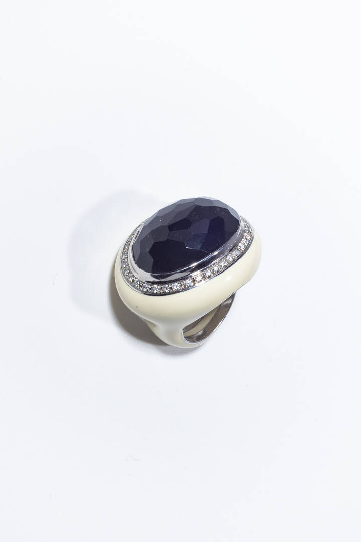in oro bianco ed argento, sommità con onice briolette taglio ovale contornato da fila di diamanti taglio brillante per totali ct 0,55 ca; gambo in smalto bianco. Firmato "Allegra".