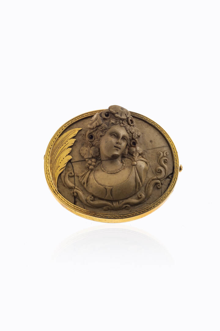 in oro giallo, con grande cammeo in pietra lavica inciso con figura femminile (rotture), inizi XIX secolo.