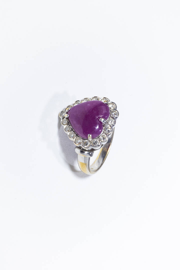 in oro giallo rodiato, sommità con radice di rubino taglio a cuore cabochon, contornato da diamanti taglio brillante per totali ct 0,80 ca.