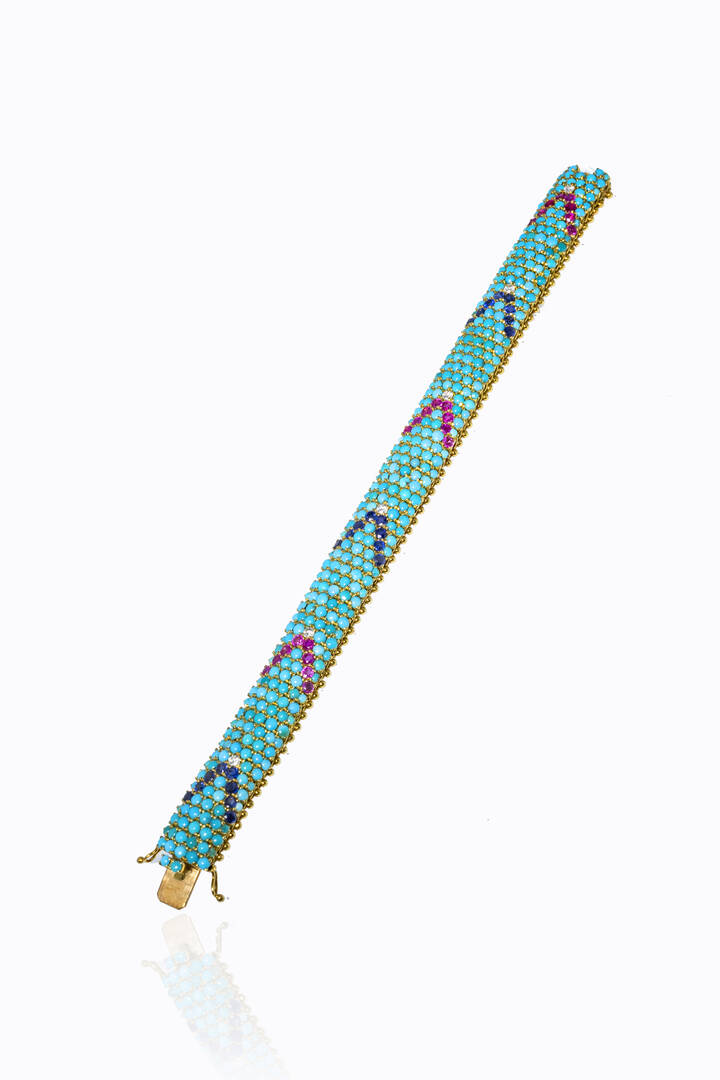 in oro giallo, anni '60, con turchesi cabochon e file di rubini, zaffiri taglio rotondo per totali ct 3,0 ca e diamanti taglio brillante per totali ct 0,20 ca.