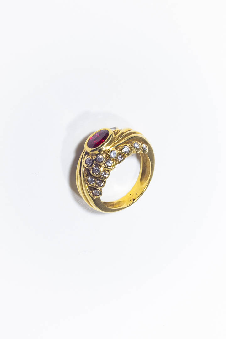 in oro giallo, anni '60, sommità bombata con al centro un rubino taglio ovale di ct 1,0 ca e diamanti taglio brillante a decoro per totali ct 0,70 ca.