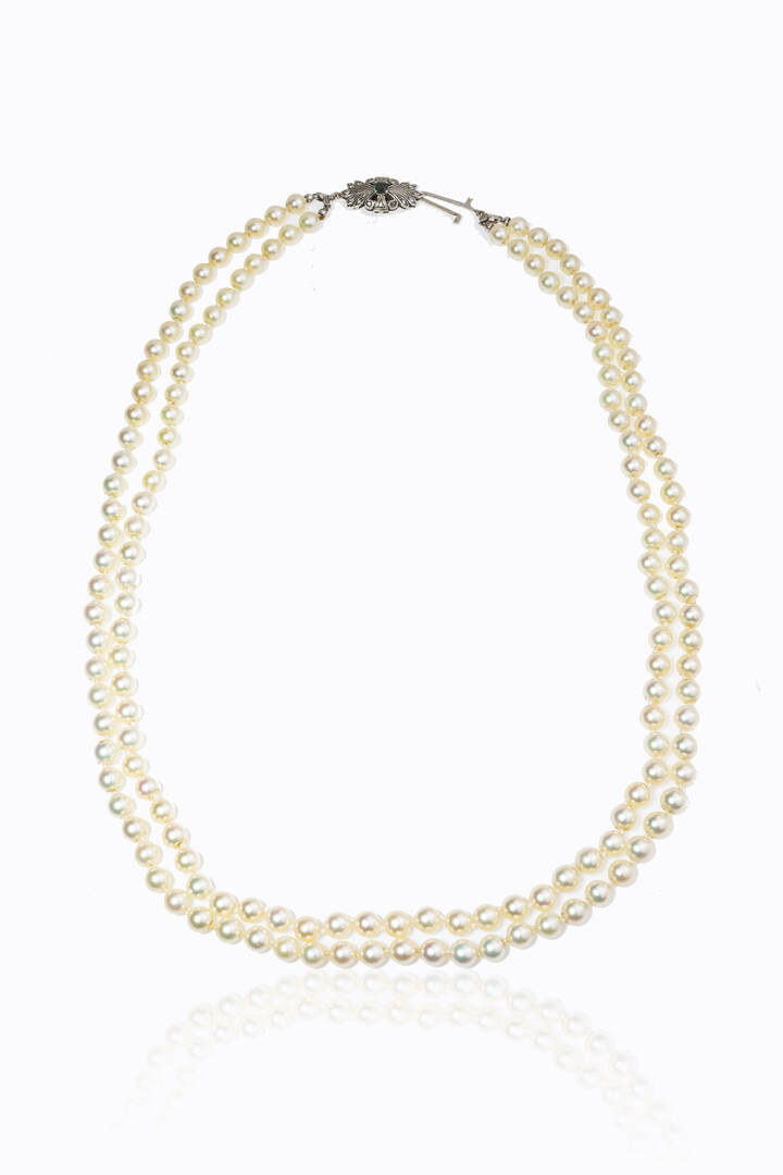 composta da due fili di perle giapponesi del diam. di mm 7,5. Chiusura in oro bianco con smeraldo taglio ottagonale a gradini e diamanti taglio 8/8 per totali ct 0,15 ca.